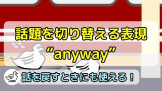 “anyway”は「とにかく」「それはさておき」「話を戻すけど」を意味する英語表現です。話題を切り替えたり、話を元に戻すときに使うクッション言葉で、『文頭』でよく使われます。またスラングではないですが、かなりカジュアルな表現になります。