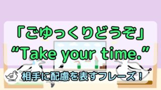 かんたん英会話Take your time.|『ごゆっくり~』『ゆっくりしてね』を意味する英語! 今回は “Take your time.”「ゆっくりしてね」「急がなくていいよ」をご紹介します。相手を気遣う優しい表現で、特にホテルやカフェなどの接客シーンで使われたりします。使うよりも聞くことが多いフレーズだと思います。例文付きでわかりやすく説明します。 2025.12.02かんたん英会話