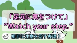 かんたん英会話Watch your step.|『足元注意』『足元気をつけて』を意味する英語 "Watch your step."は、「足元注意」「足元気をつけて」を表す英語表現です。危険を防ぐために注意を促すシンプルなフレーズで、誰かに「足元に気をつけてね!」と優しく声をかける際にピッタリです。英語初心者の方向けにわかりやすく、使い方や例文を説明しています。 2024.05.22 2025.11.08かんたん英会話